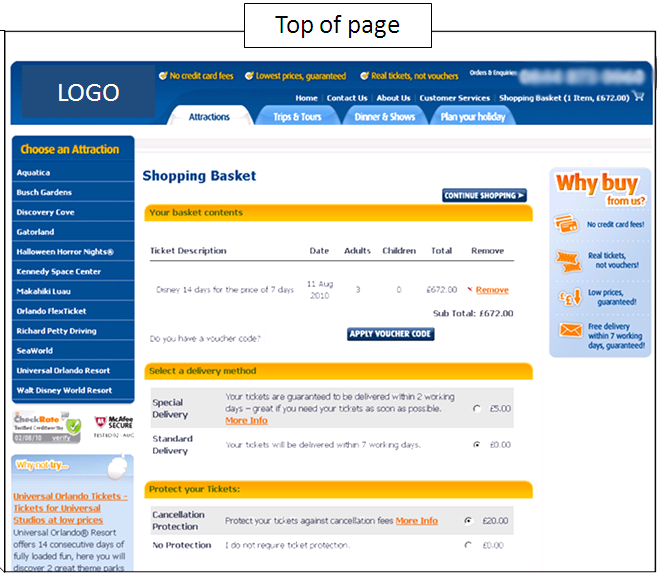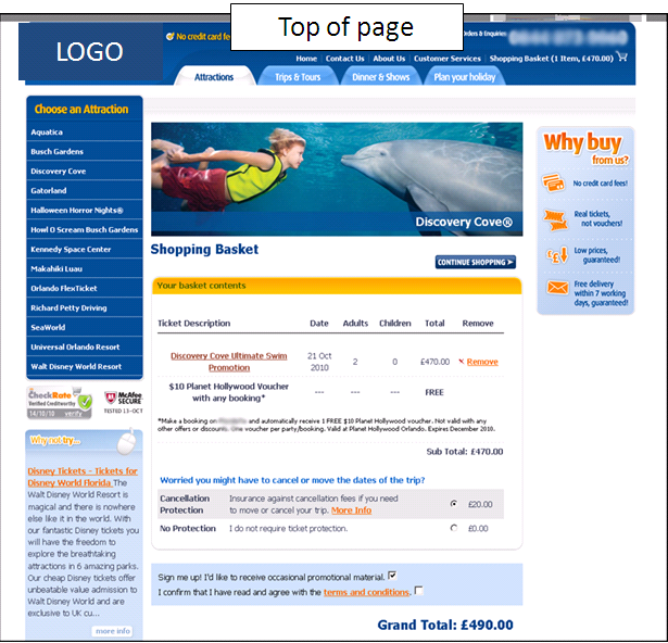 This experiment involves a United Kingdom-based online ticket broker offering residents a series of exclusive vacation packages for Florida theme parks, tours and attractions. The page tested here is the final steps in the checkout process for purchasing a vacation package via the site.
