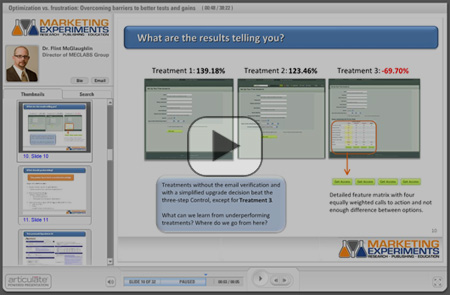 In our July 15 web clinic, Dr. Flint McGlaughlin reviewed the same research-driven testing strategies and protocol that MarketingExperiments uses to achieve the ROI gains detailed in our case studies. He also examined a recent experiment that showed how this approach yielded a 119% sales increase.