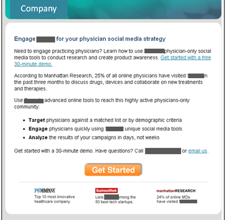 2. Email A opens with “Need to engage….?” They have already given me an opportunity to say no and I haven’t even gotten to the second sentence. With a “no” answer, I am hitting delete without getting to their value statements. Email B uses the first paragraph to get right to the point. Numbers like 68 and 35,000 automatically grab my attention in a sea of text, and sandwiched between words like “specialties, drugs, products, procedures” the email is becoming more targeted.