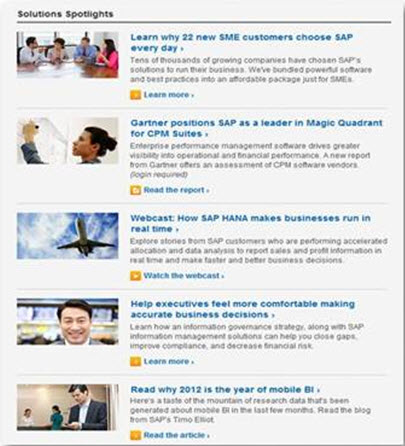 Background: SAP identified the “Spotlights” section on SAP.com as a key area at driving traffic to deeper levels of the website, where more topically specific content can be engaged.  This area was very text heavy.
