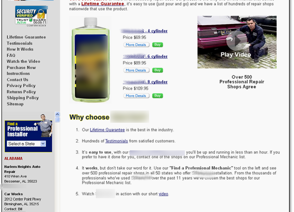 The lower half of the page continues the supportive value statements with a BBB rating icon, finally ending with a quick explanation of how the product can easily fix your car, both in text and the testimonial video.