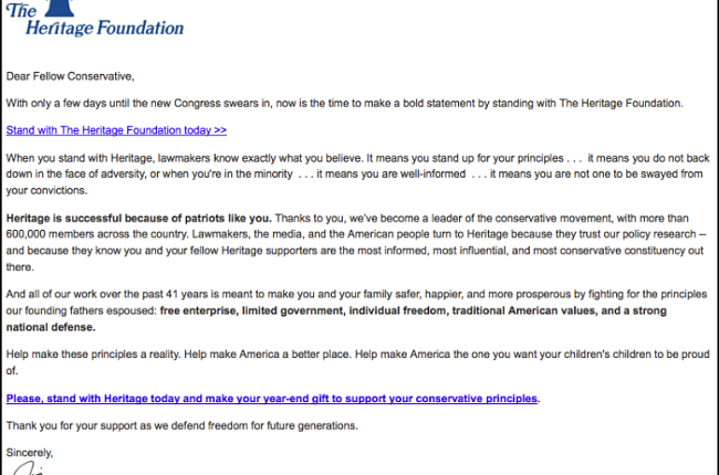 Background: The Heritage Foundation, a think tank, was soliciting end-year donations.