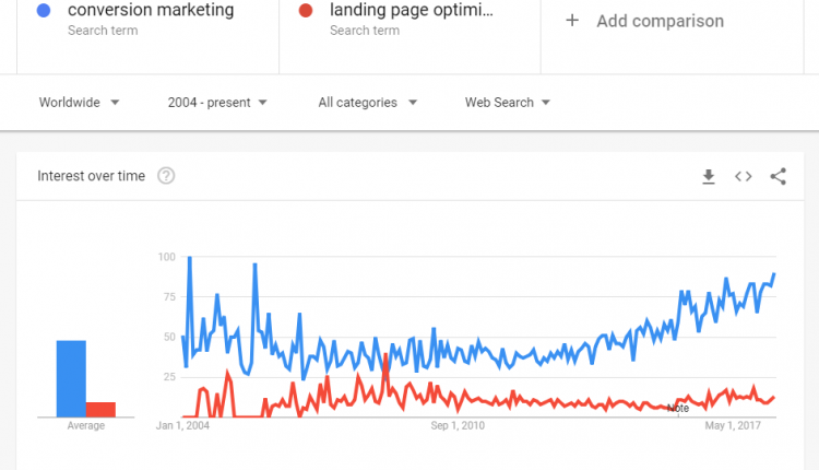 But since then, conversion marketing has pulled away in popularity. In May 2018, conversion marketing had a comparative search index of 87 with landing page optimization at 14 (Data Source: Google Trends).