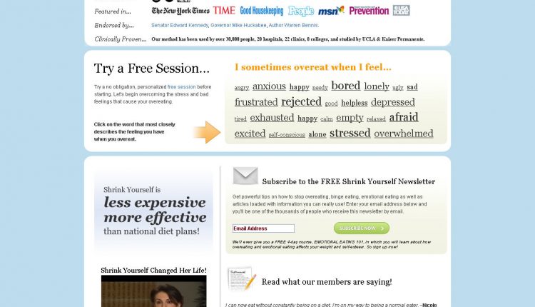The landing page was submitted by a recent attendee to a MarketingExperiments webinar, ShrinkYourself.com. The site’s name is a pretty clever pun as their primary product is a 12-week weight loss program that focuses on the connection between emotional health and dietary improvement.