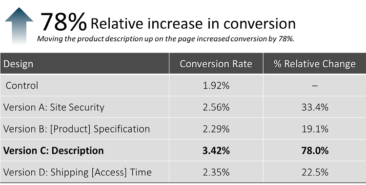 It is crucial to note that while Version C produced the largest increase, each treatment page outperformed the control.  In other words, in every case where we took steps to alleviate customer anxiety, conversion went up. These results underscore the importance of this effort, as well as the relative ease with which gains can be achieved.