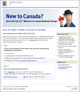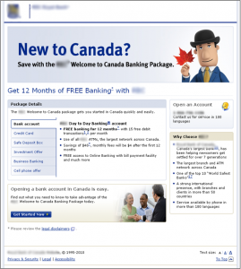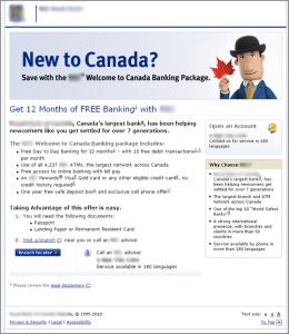 The control layout opens with a well-defined target, asking visitors if they’re “New to Canada?” followed by two fairly clear value statements – first, “Save with the XXX Welcome to Canada Banking Package” followed beneath by “Get 12 Months of FREE Banking with XXX.”