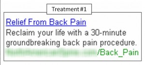 Treatment #1 also used a positive message, focusing on what the potential customer would get – “back pain relief.”