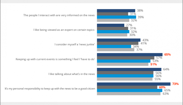 Similarly, while 65% of people 56 and older agreed that keeping up with current events is something they feel they “have to do,” just over half of 25- to 35-year-old Millennials (51%) felt that way.