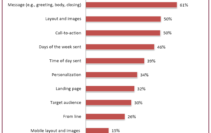 “I’m somewhat surprised at the relative positions of email specifics versus call-to-action (which I assume means ‘offer’) and target audience. Part of this may be due to how the question is worded and whether recipients view the whole email interaction as ‘test-able’ or just campaign specifics,” said Prugh Roeser, founder, LeadLogix.