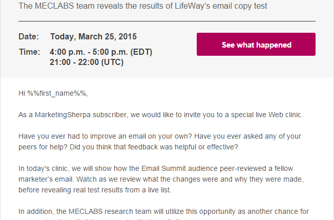 We tested an email invitation for a recent follow-up Web clinic MarketingSherpa hosted. The clinic’s objectives were to examine the results of a live optimized email test, which was run by the MarketingSherpa audience at Email Summit 2015 alongside Flint McGlaughlin.