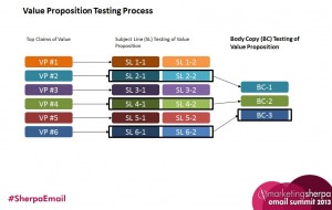 Next, Austin showed the audience how ranked value proposition claims should be crafted into competing subject lines and tested using multivariate A/B testing.