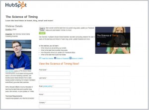 “The Science of Timing” was hosted by Dan Zarrella, HubSpot’s Social Media Scientist, and was built on a previous series of webinars over the last two years covering topics such as “The Science of Twitter,” “The Science of Blogging,” “The Science of Facebook,” and more. “The Science of Timing” covered when to do these social activities — when to tweet when seeking a retweet, when to publish new blog posts, when to update a Facebook status.