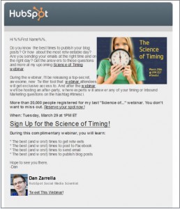 At the end of March, HubSpot, the marketing software company, held a webinar on “The Science of Timing.” The event drew almost 25,000 registrants and ended up with very close to 10,000 attendees. Driving this success was a fast-paced and extensive email campaign sent to different segments of HubSpot’s list, prospects and new leads.