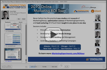 Part 1 and Part 2 in our series focused on five key ways to optimize email marketing. In Part 3, the largest MarketingExperiments team to ever conduct a live web clinic Andy Mott, Jimmy Ellis, Boris Grinkot, Adam Lapp, and Corey Trent optimized audience submissions to give you some practical “rubber meets the road” examples of our proven principles in action.