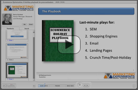 On September 30, MarketingExperiments presented a special guest clinic with renowned ecommerce analyst and GetElastic blogger Linda Bustos, where we presented a playbook of test ideas and tactics you can use right away and get back in the race.