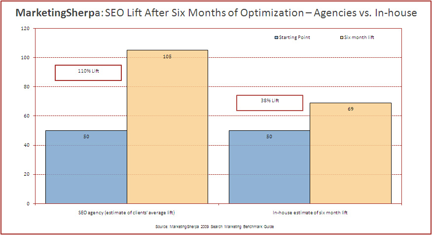 With those two audiences in mind, we also reviewed research from MarketingSherpa’s 2009 Search Marketing Benchmark Guide. Posed to nearly 4,000 SEOs, both agency and client-side, the following survey asked about the typical SEO lift after six months.