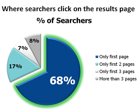 Even tougher is that 68% of searchers only click on the first page of results – and many of those likely won’t scroll down to the bottom. For your site to be seen by the vast majority of searchers, it needs to appear on the first page, if not in the top five to seven results (where many screen resolutions will break the page).