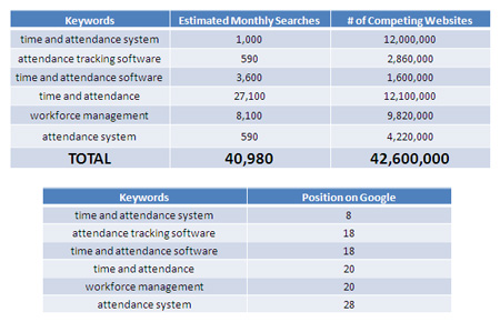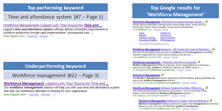 At position seven, Legiant is on page one but still below the fold. The site could boost its current traffic by three to four times by moving up to positions one through four. The keyword phrase “workforce management” is an area where improvement could make a significant difference, because the site currently appears on page three, and as a result, it is practically invisible to 85% of searchers.
