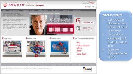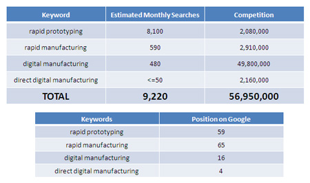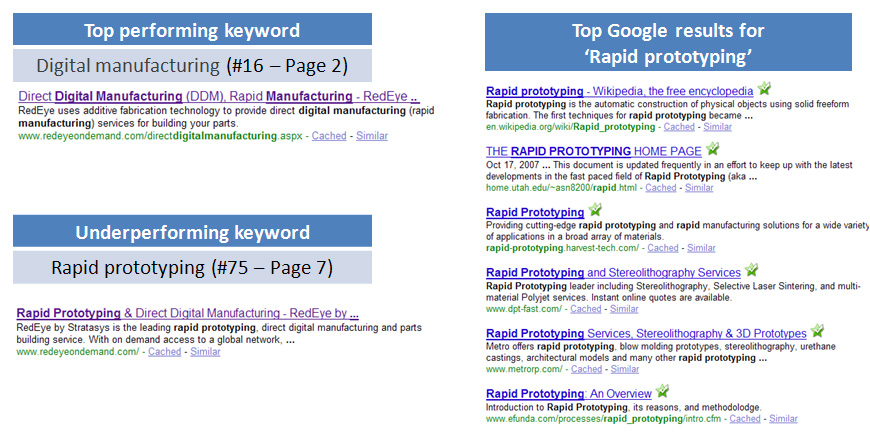 The site appears just above the fold for “direct digital manufacturing”, yet for other more popular terms like “rapid prototyping” the site is practically invisible. Redeye could improve in these areas by focusing on inbound links.