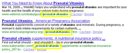 In the first three search results for “prenatal vitamin”, each site uses those keywords in the URLs: