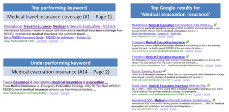 Many of Legiant’s keywords are in an “inflection point” – appearing on page two or three of search results. This means it has momentum and it won’t take too much to move up to page one. After making minor page title tweaks, the site should see an increase in rankings after the next two Google spider crawls (within 60 days).
