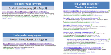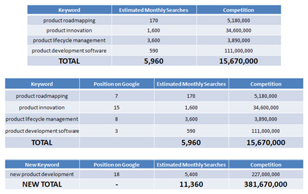 The strategy for this site should be to get as granular as possible with its keywords. The popularity of its keyword selection is relatively low, which is typical for a big-ticket B2B product. With almost as many monthly searches as its entire existing keyword group, the keyword “new product development” should be incorporated into the site.
