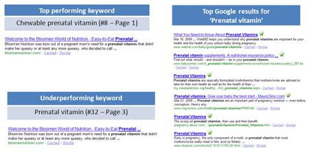 Bloomen currently ranks at the top of page three for the keyphrase “prenatal vitamins”, which makes up the majority of searches for this target. With 1.5 million competitive pages it is not as competitive as many other keywords, so a high page-one position is attainable with some SEO fundamentals, starting with placing the keyword in the URL.